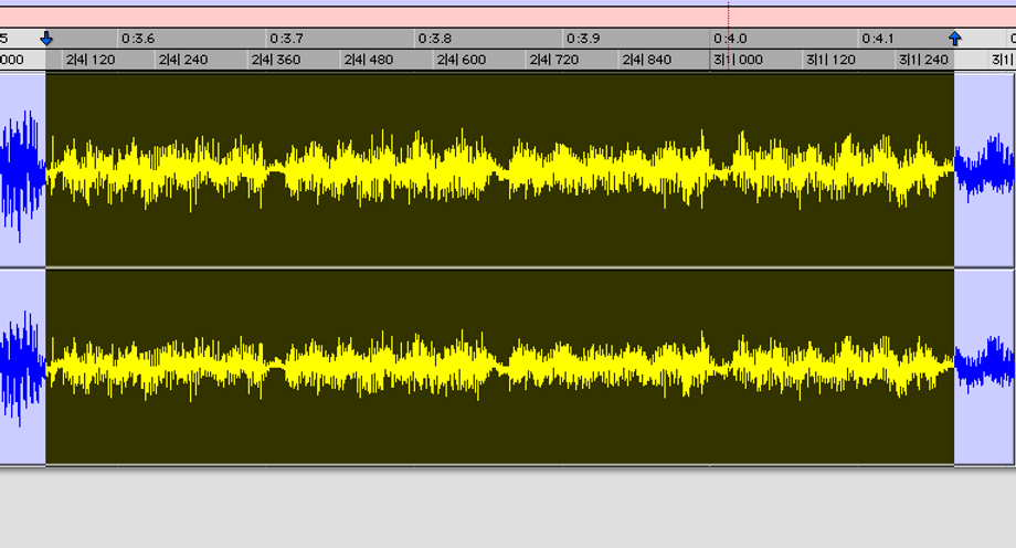 Parto de la base de que cada uno de los ciclos de sonido que escuchamos se encuentra en una frecuencia distinta (no se si mucha o poca, puesto que no se como esta configurado el escáner de frecuencias). Es decir, entre cada uno de los cortes de sonido, hay un cambio de frecuencia en el escáner, de manera que la frase se produce desde distintas frecuencias. Si las frecuencias fueran muy cercanas, podría ser que en realidad recibiéramos la misma emisión que interfiere en las frecuencias aledañas, pero en esos casos hay un degradado de la señal entre la banda que seria la que esta emitiendo dicha señal, con la “máxima calidad” y las frecuencias aledañas, que tendrían peor calidad cuanto mas lejos estuvieran de la frecuencia emisora. En este caso, parece que todas las silabas tienen la misma calidad y volumen.