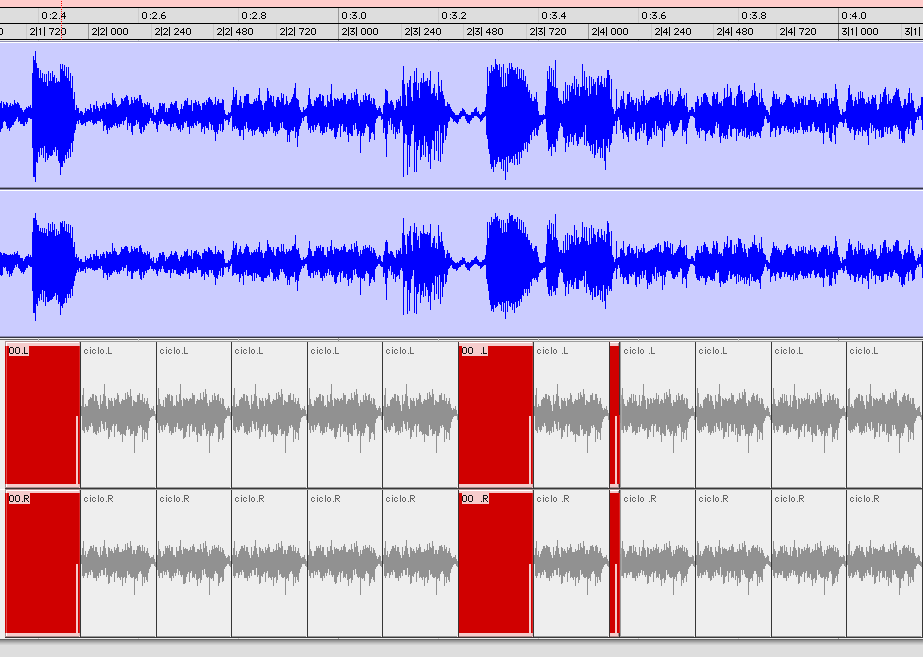 1. Por un lado, y quizá esto no sea lo mas relevante, parece que los ciclos de escaneo se rompen cuando se producen las voces (hablo exclusivamente del archivo de audio analizado). En la imagen de abajo se puede ver como esa regularidad se des-sincroniza cuando aparecen las “voces”. En la imagen, las formas de onda con mayor volumen (mayor tamaño) corresponden a las voces, y las de menor tamaño, donde se aprecia la regularidad de esos ciclos de escaneo, corresponden al ruido sin contenido inteligible.